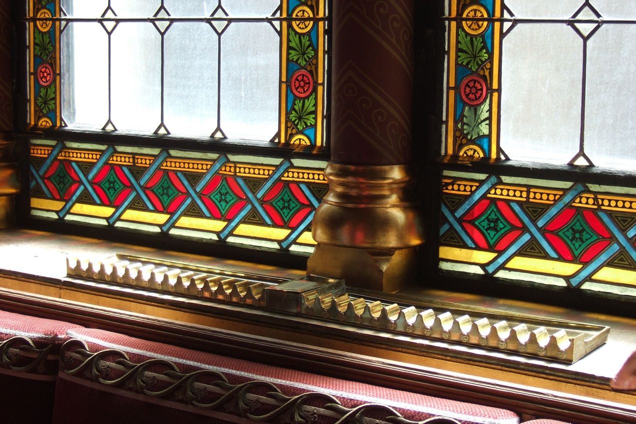 Т.к. в самом зале заседаний курить не разрешалось, то при входе в зал на подоконнике витражного окна были сделаны специальные подставки, куда можно было класть сигары.
