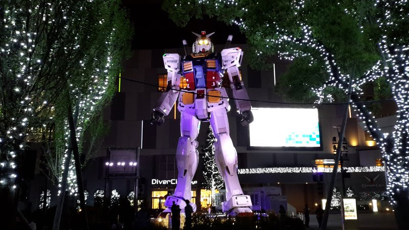 Обратно решили ехать не на Юрике, а на своем JR, надо же его использовать. По дороге наткнулись на «Мир будущего», где можно совершить короткую виртуальную поездку (не знаем какую) в будущее. Про этот центр мы знали, но специально не искали и не думали, что так сразу на него и выйдем. Перед центром стоит огромный - высотой 18 метров - робот "Гандам" - герой одноимённого японского мультсериала, уже отметившего свое 35-летие.