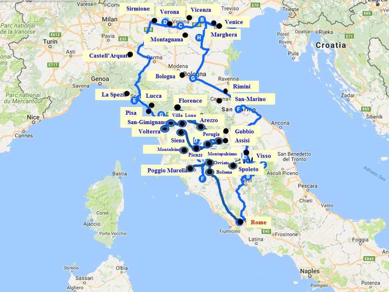 Spoleto - Visso - Assisi - Gubbio - San-Marino - Rimini - Bologna - Montagnana - Mestre-Marghera - Venice - Mestre-Marghera - Vicenza - Verona – Sirmione - CastellʼArquato - La Spezia - Chinque Terre - Pisa - Lucca - Firenze - Arezzo - Perugia - Montepulcianо – Пьяная дорога - Pienza - Volterra - San-Gimignano - Siena Montalcino - Кипарисовый остров - Cappella della Madonna di Vitaleta - Bagni Vignoni - Sorano - Pitigliano - Saturnia - Orvieto - Civita di Bagnoregio- Bolsena – Rome