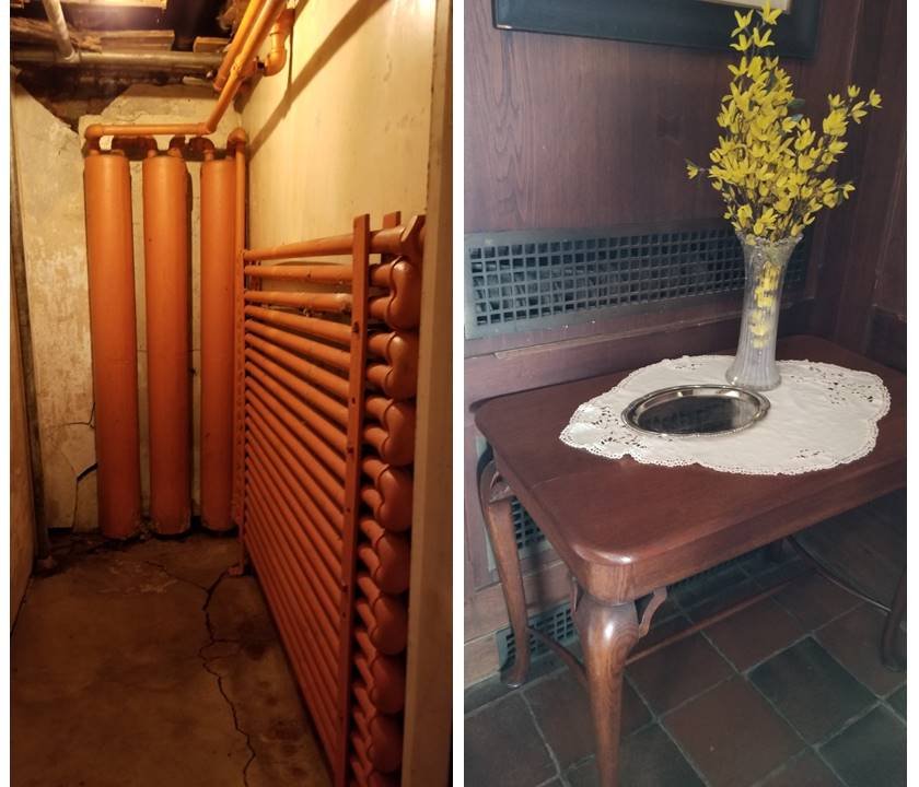 дополнительно существовала система воздушная система. Воздух поднимался по трубам в жилые помещения верхнего этажа (фотка слева) и поступал в комнаты через систему вентиляции. (фотка справа)